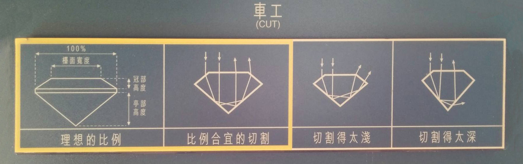 事實上,一顆符合GIA切割比例、切割精細的鑽石,它的每一個切面都能完美折射出光線,充分呈現鑽石的耀眼美麗,並提升鑽石的價值;相對的,車工不好的鑽石,因切面的不規則或比例過深、過淺,則會使光線凌亂且無法完整反射出來,大大減損一顆鑽石應有的價值。