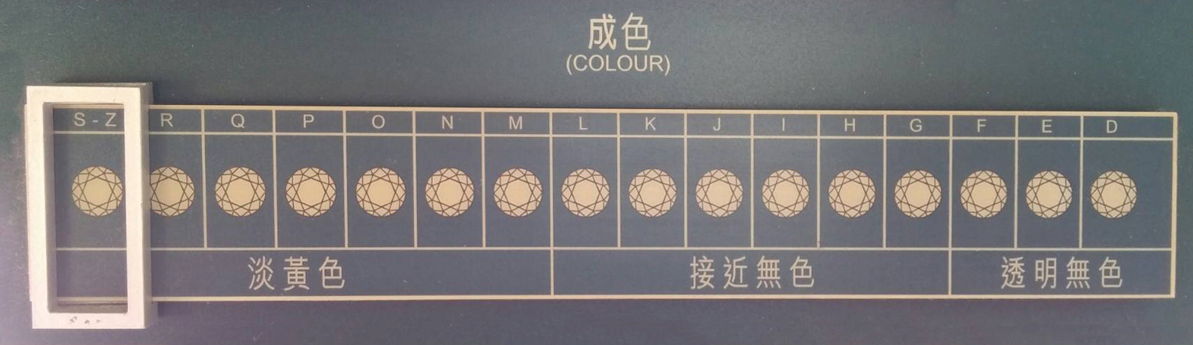而由GIA所創立的成色等級系統中,將鑽石成色由D(透明無色)至Z(淺黃色)分級,越接近無色(成色D),價值越高;隨著成色的加深,鑽石等級逐漸下降,此評定標準可精確鑒別每顆鑽石的顏色等級。